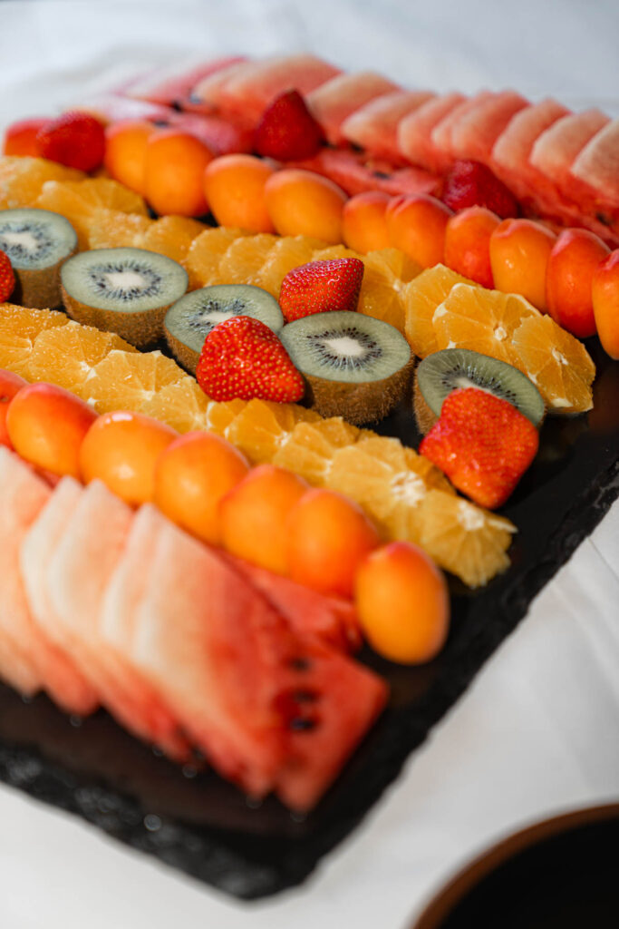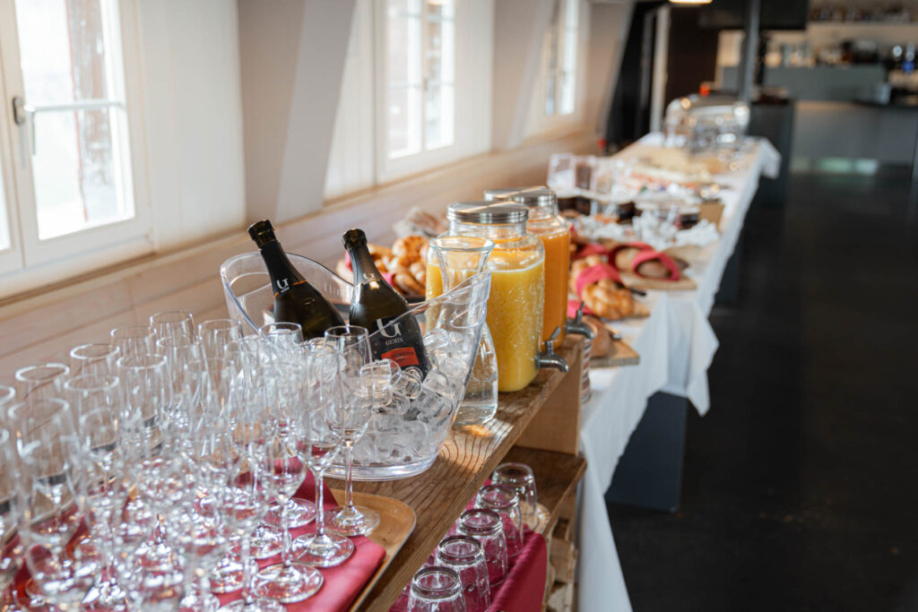 kalte Fleischplatte, grosszügige Käseauswahl von der Dorfkäserei Schmid, geräucherter Fisch, Lachs, knusprige Rösti, gebratener Speck, Eierspeisen, Pancakes, frische Früchte, Joghurts und Cerealien und etwas Süsses zum Schluss. Dazu Kaffee, Tee, Cappuccino, Latte Macchiato, diverse Fruchtsäfte und ein Cüpli Prosecco zum Anstossen.