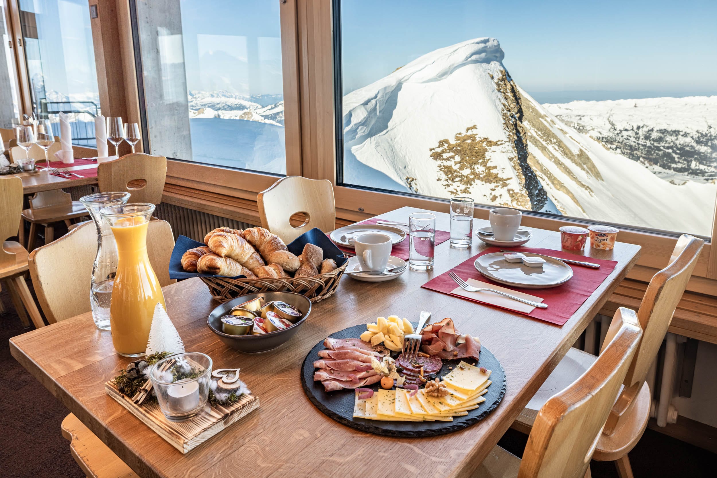 Das Gipfel-Zmorgä wird täglich von 8.30 bis 10.00 Uhr im gemütlichen Gipfel-Restaurant Rothorn serviert-während der gesamten Wintersaison. Die erste Bahnfahrt ist um 08.30 Uhr.