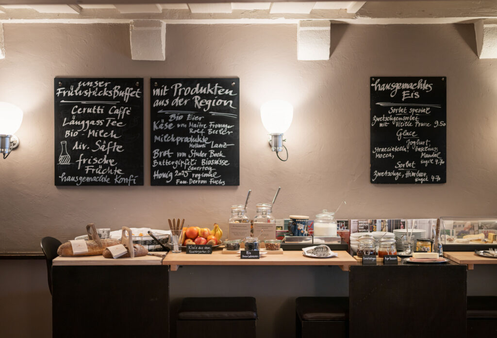 Im Baseltor geniesst du ein kontinentales Frühstück aus regionalen Produkten. Im Restaurant oder an der Morgensonne servieren wir dir perfekt gerösteten Cerutti-Kaffee und Tee von Länggass in Bern und Al Canton im Puschlav.