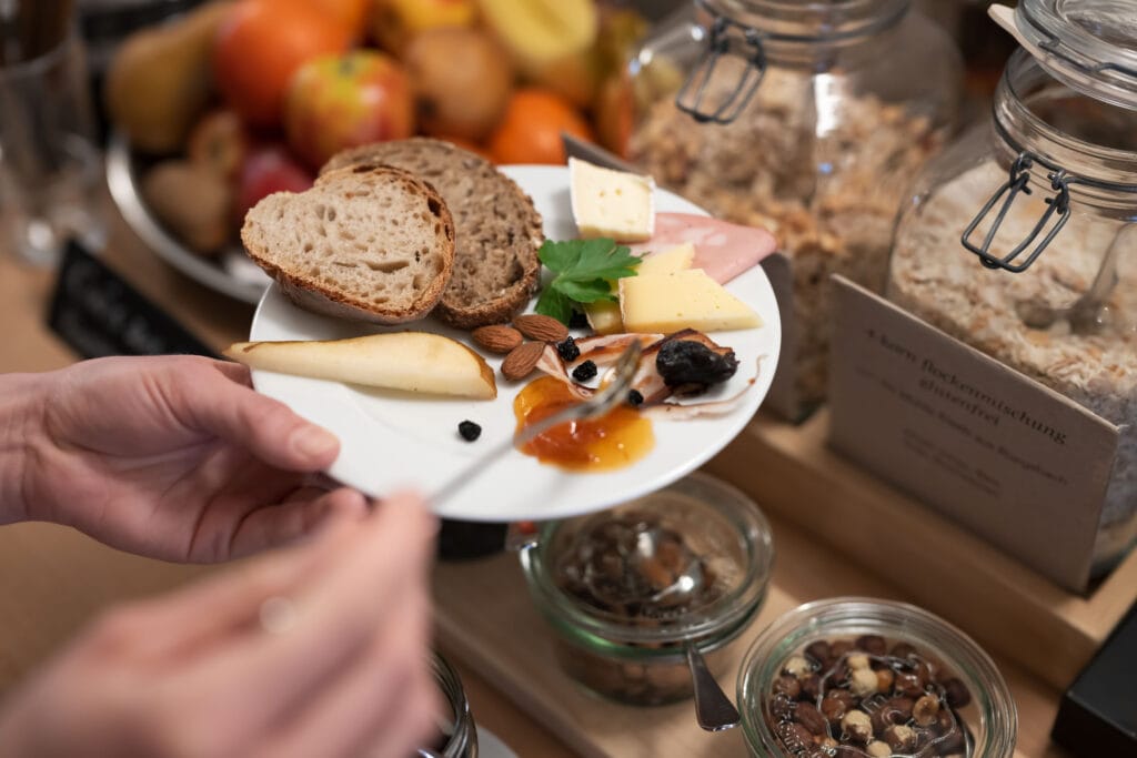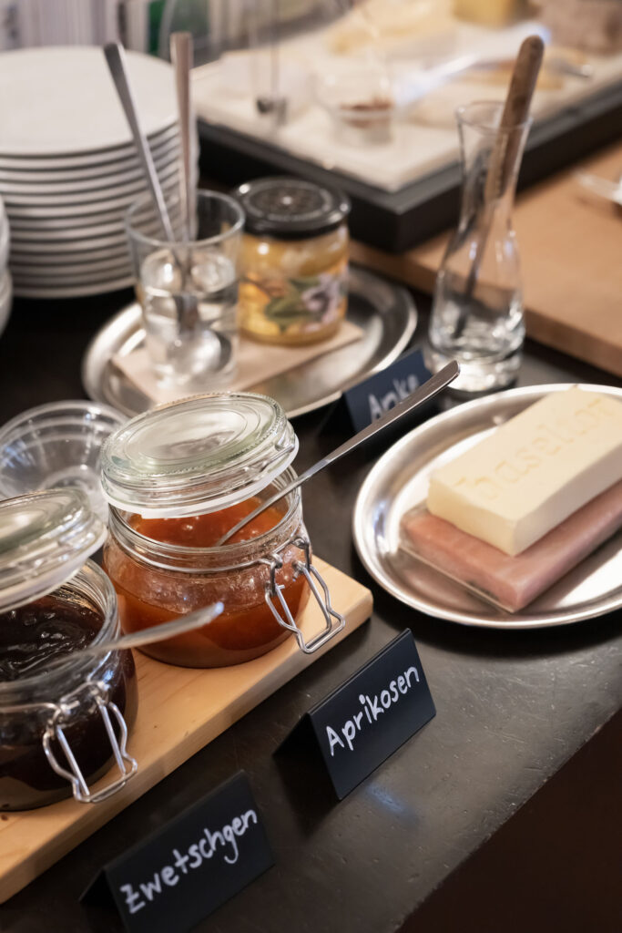 Auf unserem Buffet findest du Brot von unserem Nachbar, der Feinbäckerei Studer, Anke von der Emmentaler Dorf-Chäsi Koppigen, hausgemachte Konfitüren, Honig aus der Region, gekochte Bio-Eier, Joghurt der Molkerei Lanz in Obergerlafingen, Müesli der Mühle Kleeb in Rüegbsbach, verschiedene Käse von Rolf Beeler, Aufschnitte, und Früchte von regionalen Produzenten, Orangen-, Apfel- und Cranberrysaft.